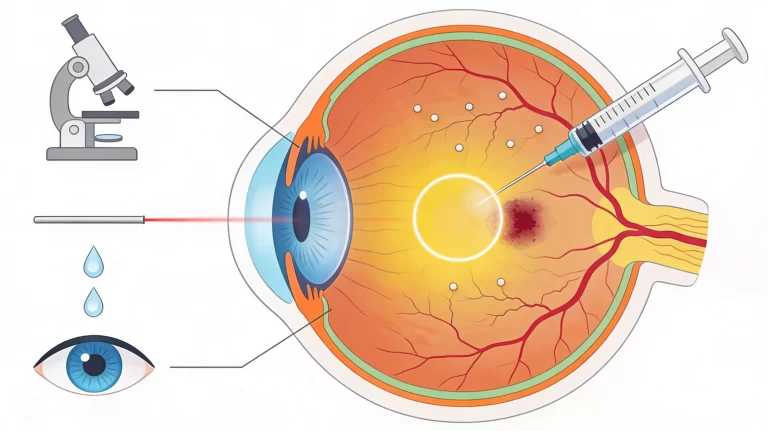 Procedura medica checonsiste nell’iniettare farmaci direttamente nel corpo vitreo dell’occhio per trattare diverse patologie retiniche, tra cui la RD e l’EMD; i farmaci comunemente usati includono gli anti-VEGF per ridurre la crescita dei neovasi e i corticosteroidi intravitreali per diminuire l’infiammazione e il gonfiore. In alcuni casi potrebbe essere necessaria anche la fotocoagulazione laser per trattare i vasi sanguigni danneggiati nella retina.24,25,26
